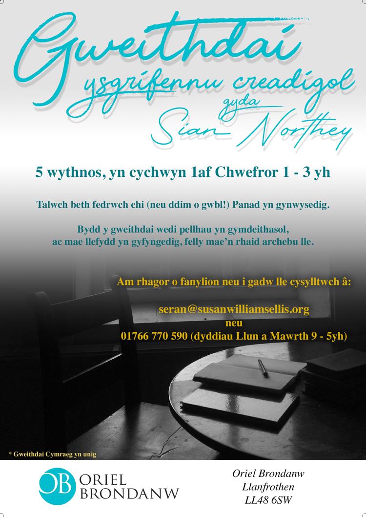 Bydd y bardd a'r llenor Sian Northey yn arwain y gweithdy yma yn ymateb i weithiau celf yn ein arddangosfa agored ar y thema 'Gofod'. Mae'r arddangosfa yn llawn gwaith celf gan dros saith deg o artistiaid, felly mae digon o amrywiaeth i sbarduno eich ymateb creadigol. Bydd Sian Northey yn eich tywys trwy'r broses o lunio ymateb mewn geiriau i rai o'r gweithiau hyn. Nid oes angen unrhyw brofiad blaenorol o ysgrifennu barddoniaeth, dim ond parodrwydd i arbrofi a mwynhau gwneud cysylltiadau rhwng y celf gweledol a'r gelfyddyd geiriol.